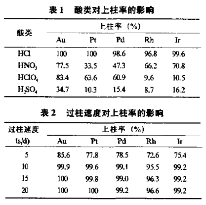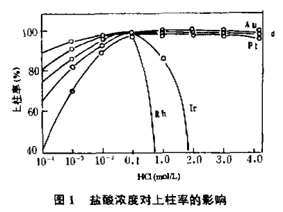 试验证明:(1)酸类对上柱有影响(见表1)。由表l可见,贵金属在盐酸介质中形成氯配离子最稳定,除Rh上柱在96.8%外,其余4个贵金属均在99.6%~100%且发现氧化酸类对刚果红形成树脂有破坏作用。故选HCl为工作介质。(2)盐酸浓度对上柱率有影响(见表1)。由图l可见,pH1.0时,五种贵金属上柱率都最高。故选pH1.0为最佳实验酸度。(3)过柱流速对上柱率有影响(见表2)。由表2可见,过柱流速≥8秒/滴,Au,Pd,Pt,Ir,Rh均能定量 回收。选15秒/滴为最佳实验过柱流速。