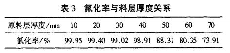 影响氟化率的主要因素有料层厚度、温度等。原料装在托盘分层放置,从过去的研究中知道气一固反应初期外扩散途径短反应快,一定时间后以内扩散为主,反应较慢。装料太厚不利于HF气体的渗透,装料太薄炉体的利用率降低,成本增加,最佳条件是40mm。表3为氟化率与料层厚度关系。通气速度5kg/h~8kg/h,反应温度450℃~550℃,原料氧化(镨)钕。