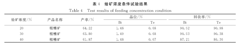 矿浆浓度过高,磁选过程易产生磁团聚夹杂叶碲铋矿致使回收率降低,矿浆浓度过低,随有利于分选效果,但处理量受影响。选择240 kA/m的磁选场强进行给矿浓度条件试验,试验结果见表4。