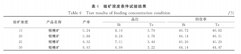 悬震锥面选矿机为薄膜流分选,叶碲铋矿粒度微细,宜采用较低的给矿浓度以便于物料的分散。试验采用振动频率20Hz、转动频率20Hz,改变矿浆浓度进行试验,给矿浓度条件试验结果见表6。