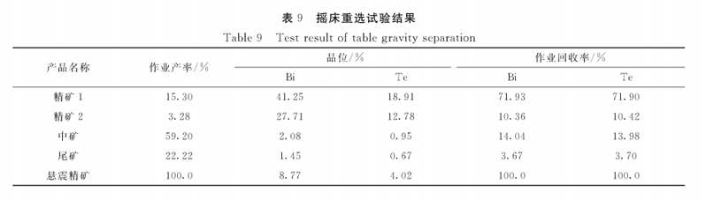 磁选一悬震锥面选矿机重选所得粗精矿经摇床重选获得最终精矿,为尽可能地提高碲、铋的回收率,对摇床中矿进行再次摇床重选。试验流程见图4,试验结果见表9。