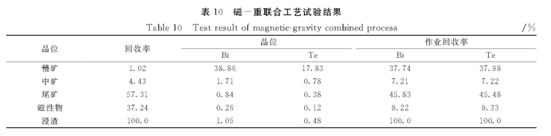 在上述试验条件的基础上进行联合工艺综合条件试验,试验流程见图5,试验结果过见表10。由表10试验结果可知,磁一重(悬振锥面选矿机+摇床)联合工艺可得最终精矿铋品位38 86%、碲品位17.83%,铋、碲回收率分别为37.74%、37. 98%的碲(铋)精矿。