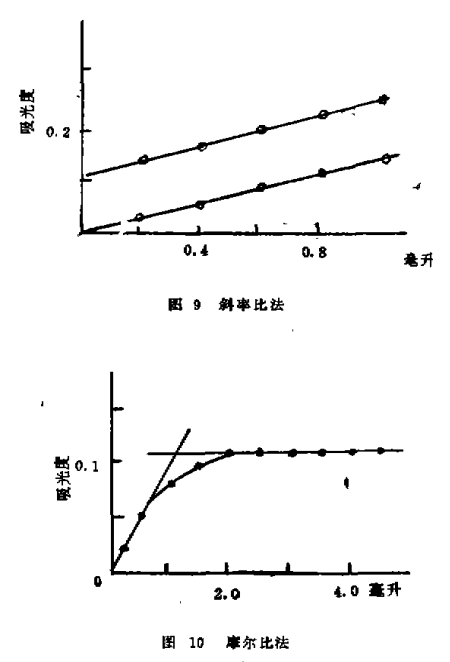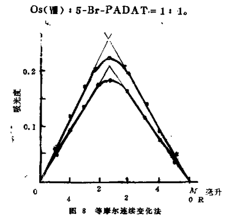 本文采用等摩尔连续变化法(图8),斜率比法(图9)、摩尔比法(图l0)及平衡移动法(表1)四种方法,测得络合物的组成均为:Os(Ⅷ):5-Br-PADAT=1:1。