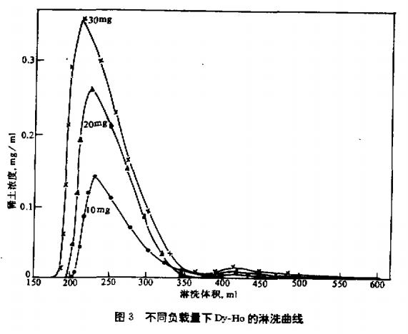 在洗液酸度07molL、流速065mlcm2·min、柱温50℃,以95%Dy-5%Ho为原料,负载量分别为102030mg下进行试验,其结果如表3和图3所示。由图可见,负载量增大,淋洗峰前移,峰值增高,两元素交叉区增大,分离效果下降。但考虑到负载量太小,产量太低,所以选择负载量20mg较佳。由表看出,分离因素平均值为204