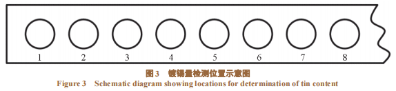 如图3所示,从镀锡板边缘向内依次截取8个直径为50mm的试样,依据GB/T1838–2008《电镀锡钢板镀锡量试验方法》,采用EDTA(乙二胺四乙酸)滴定法检测其边部镀锡量,结果见图4。对于镀锡量相同的镀锡板,使用MSA体系时边部镀锡量与目标镀锡量更接近,厚度分布更均匀,边缘效应大大降低。