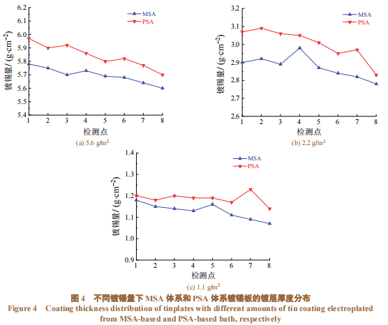 目前国内多数产线已逐步使用MSA体系代替PSA体系进行电镀锡生产。虽然MSA体系电镀锡较环保,但目前还存在一些不足,如化学药品成本较高,对工艺参数的控制要求严格。随着今后环保要求的日益严格以及生产工艺的不断成熟,MSA体系必将代替PSA体系成为电镀锡生产的主流工艺。