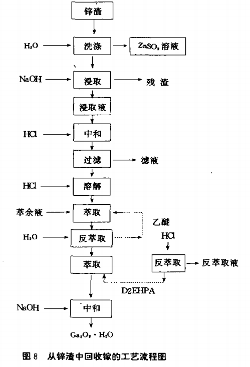 Zhou等人“提出一个溶剂萃取工艺,选择性地从湿法炼锌中净化硫酸锌溶,液的置换渣中回收铟、锗和镓。Hoff-mann。也曾提出过将硫酸锌溶液净化过程中产生的铁泥进行还原性地溶出镓.然后分步氧化水解以沉淀镓。