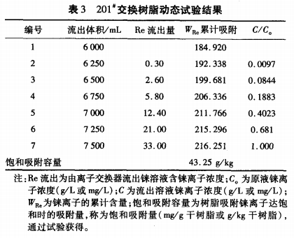 稀酸浸铼的浸出液中含铼30mg/L,含钼4g/L。为了进一步富集铼,进行了碱性阴离子交换树脂吸附试验。离子交换是借助于固体离子交换剂中的离子与稀溶液的离子进行交换,以达到提取或去除溶液中某些离子的目的。为了选择适用于该矿浸出液的交换树脂,采用不同型号的7种阴离子树脂进行了静态试验,发现201交换树脂的效果最好,并进行了动态试验验证,结果证明使用201#交换树脂能够得到很好的试验结果,因此选用201#交换树脂进行铼交换吸附。静态对比试验结果见表2,201#交换树脂动态试验结果见表3。