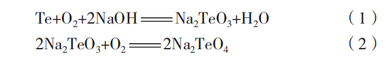 粗碲粉中主要成分为碲、铜、铅、硒,其中碲主要以单质的形态存在,同时有少量的四价碲。在氧化过程中,单质碲在碱性加压浸出条件下被氧化,以TeO3 2- 的形态进入液相。同时亚碲酸钠会出现过氧化现象,生成碲酸钠进入渣相中,影响浸出效果。主要反应方程式如下:
