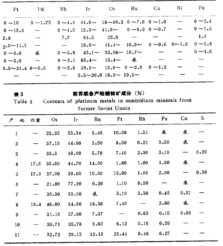 世界锇铱矿主要产于超基性岩铬铁矿型铂矿床的原生矿及砂矿中,少量见于含金石英脉内,与自然铂、粗铂矿、铁铂矿、铱铂矿等伴生而钉铱饿矿、碱铱饿钌矿还与硫镍钯铂矿、砷铂矿及其他铂、钯硫化物伴生。目前锇铱矿最重要的资源是南非威特沃特新兰德古老超变质砾岩中的金铀共生矿床。多数锇铱矿与砂矿有着密切的关系,通常与砂铂矿一起开采。世界产砂铂矿较多的地区有前苏联的乌拉尔、哥伦比亚的乔科和美国的阿拉斯加。主要砂铂矿产地的粗铂精矿成份表明,各产地的粗铂精矿中饿铱矿含量悬殊很大,其含量较多的有阿拉斯加的弗克斯久尔奇、澳大和亚的塔斯玛尼亚,前苏联的个别矿区及缅甸的密支那等地。其含量一般为20~28%,含量最高者产于阿拉斯加弗克斯久奇,高达54.76%。也有不少的砂铂矿产出的铂精矿中含饿铱矿<2%。世界各地产出饿铱矿的代表性成份见表2及表3。