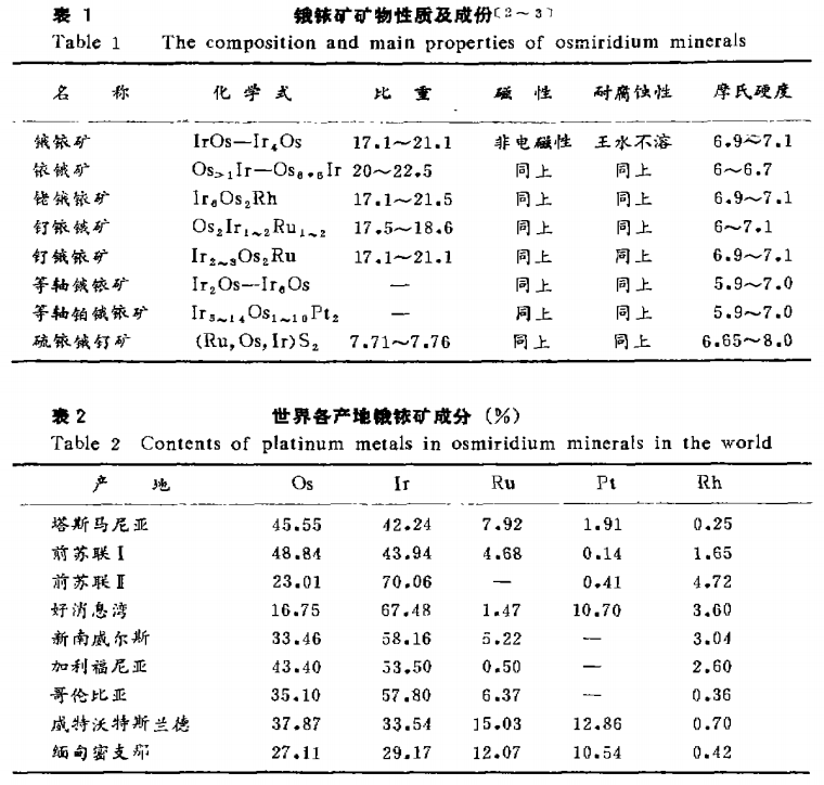 饿铱矿为银白色或灰黑色有光泽的不规则小块。常以扁平颗粒,片状或六方系的晶体形式出现。比重19~21,摩氏硬度6~7。以饿、铱含量的多少分为两种不同的矿物:以铱为主星明亮锡白色,称亮饿铱矿,以锇为主呈暗钢灰色,称暗饿铱矿。饿铱矿是天然饿铱合金,含饿和铱60~90%。常伴生有金、钌、铂、铑及少量铁和铜,含硫0.2~0.4%经机械富集后,剩有少量石英、钛铁矿、铬铁矿和磁铁矿等杂质。锇铱矿由于受河水冲刷,外表磨损大并沾有氧化铁。饿铱矿最典型的特征是不溶于王水,利用此特性与其他贵金属分离。有关锇铱矿矿物性质及成份列于表1。