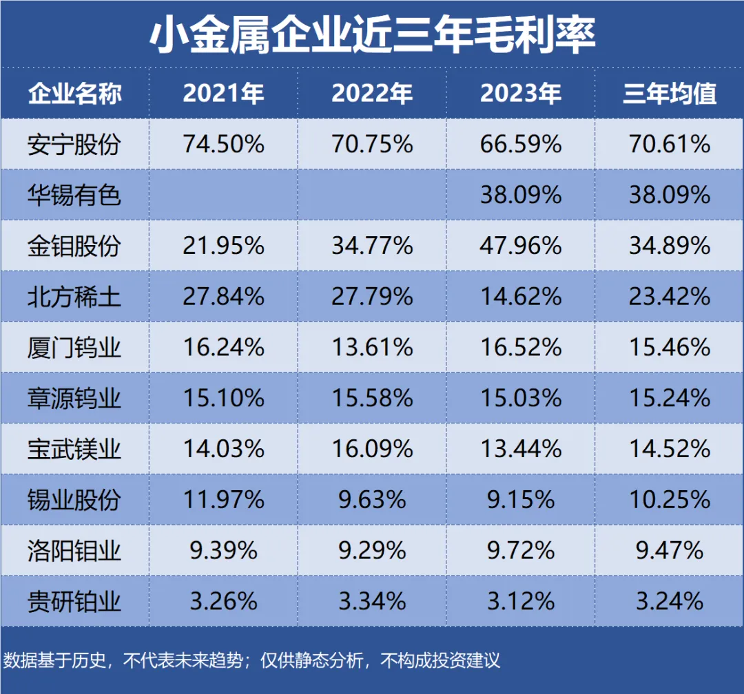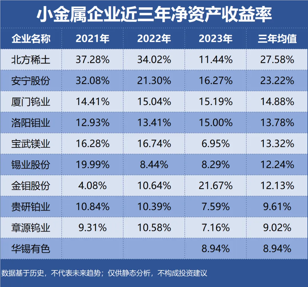 小金属盈利能力前十企业,近三年净资产收益率、毛利率、净利率