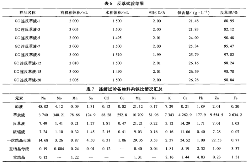 试验情况见表4~表6。表4是在前期试验的基础上进行的连续萃取铼的工艺条件。表5为连续萃取铼试验结果,表6为反萃试验结果,表7为连续试验各产物杂铼比。