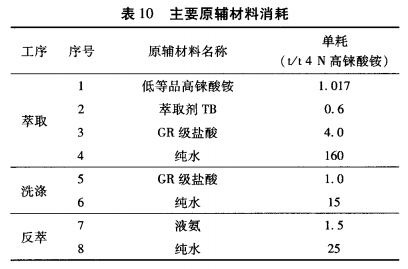 以生产1t铼酸铵为计算基础,主要原辅材料消耗见表10。