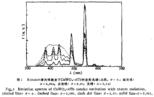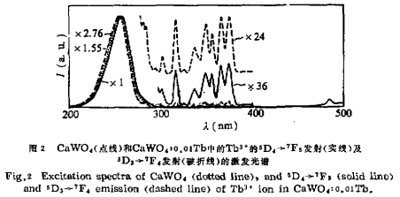 图1示出了掺杂不同量三价铽离子的钨酸钙(CaWO4:xTb)在254nrn紫外线激发下的发射光谱。钨酸钙呈蓝紫色发光,发射带中心约在420nm处。位于380、412、436、456、470nm处的发射带分别是Tb^3+离子的5D3→7F6、7F5、7F4、7F3、7F2跃迁发射,487、543,585,619nm的发射带分别是5D4→7F6、7F5、7F4、7F3跃迁发射。图2示出了CaWO4:0.01Tb中Tb^3+离子的5D3→7F4、5D4→7F5跃迁发射和CaWO4发射的激发光谱。钨酸钙发射的激发带峰值位于254nm。Tb^3+离子发射的强激发带与钨酸钙发射的激发带重叠。从图1可以看出,随着Tb^3+离子添加浓度增加,钨酸钙的发射强度降低,Tb^3+的特征发射增强。当Tb^3+浓度大于4mol时,得到很强的Tb^3+的特征跃迁发射,而钨酸钙的发射变得非常微弱,这表明钨酸根离子受激后可以有效的将能量传递到Tb^3+离子,而后产生Tb^3+的特征跃迁发射。