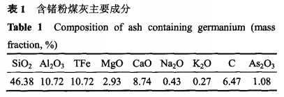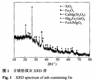 1)含锗粉煤灰中主要成分是SiO2,铁氧化物,Al2O3和CaO,还有一定量的MgO和C,其他成分含量较低,锗以以锗酸盐(Mg3Fe2GeO8)的形式存在。